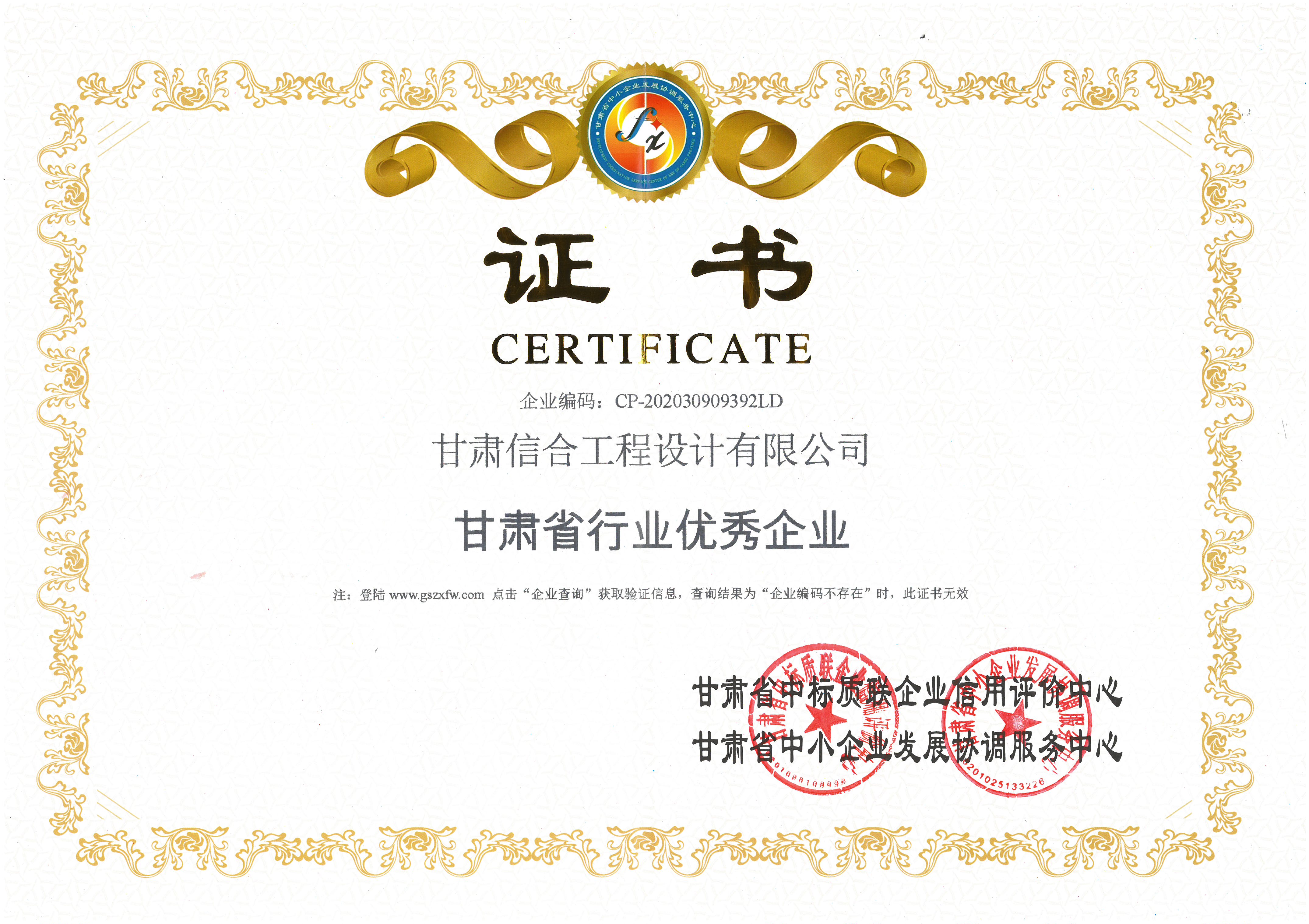 甘肅省行業優秀企業證書